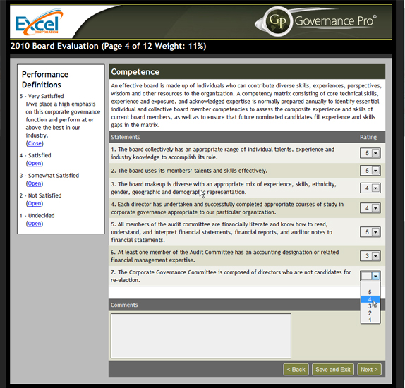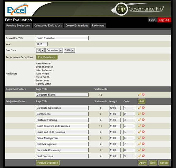Welcome to Governance Pro©Governance Pro© is the most cost-effective web-based Board/CEO evaluation tool available on the market today. Developed by leading governance experts, Governance Pro© replaces the outdated paper based board evaluation processes still used by most organizations with an innovative online board assessment solution that is guaranteed to improve board performance while saving your organization considerable time and money.